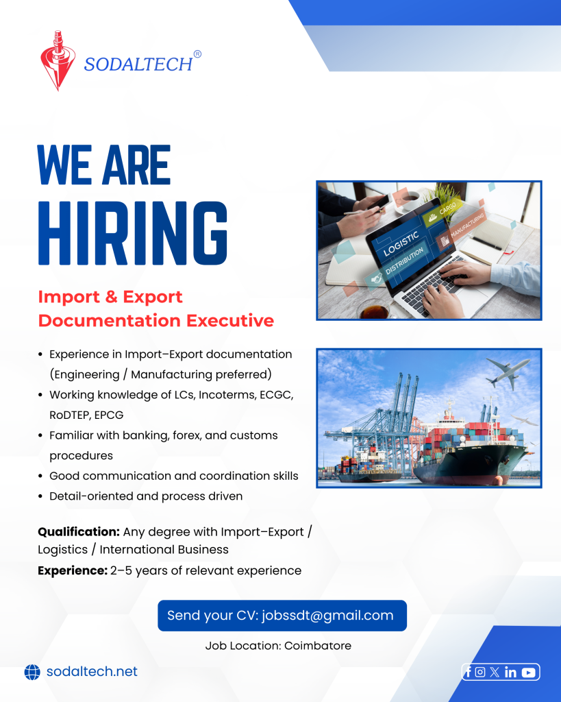 Hiring an Import & Export Documentation Executive to manage shipment documents, compliance, and banking procedures. Experience in manufacturing/logistics preferred.